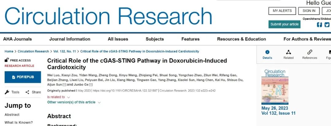 “阿霉素心臟毒性的新機制”研究旨在探索cGAS-STING信號通路在阿霉素心臟毒性(DIC)發生、發展過程中的作用機制。研究發現:cGAS-STING信號通路通過CD38擾亂心臟內皮細胞和心肌細胞的NAD穩態,進而導致其線粒體損傷,促進DIC的發生與進展。本項研究成果于2023年5月26日發表于《Circ Res》。